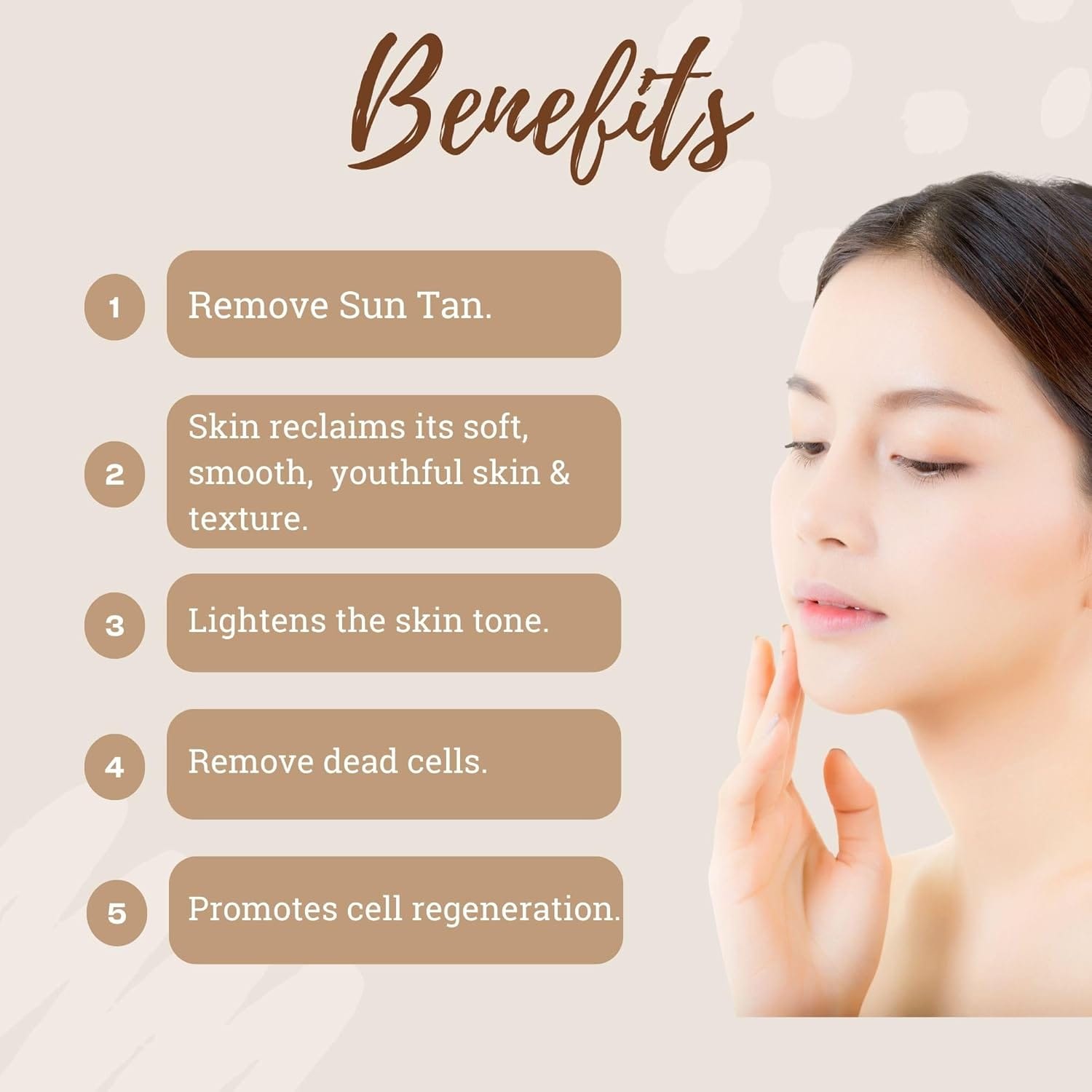 HOW TO USE: Take a generous amount of De-Tan Face Pack and mix it with rose water or normal water. Apply the pack evenly on your face & neck. Let it sit for 10 -15 min. Rinse off & pat dry. Use twice a week for better results.