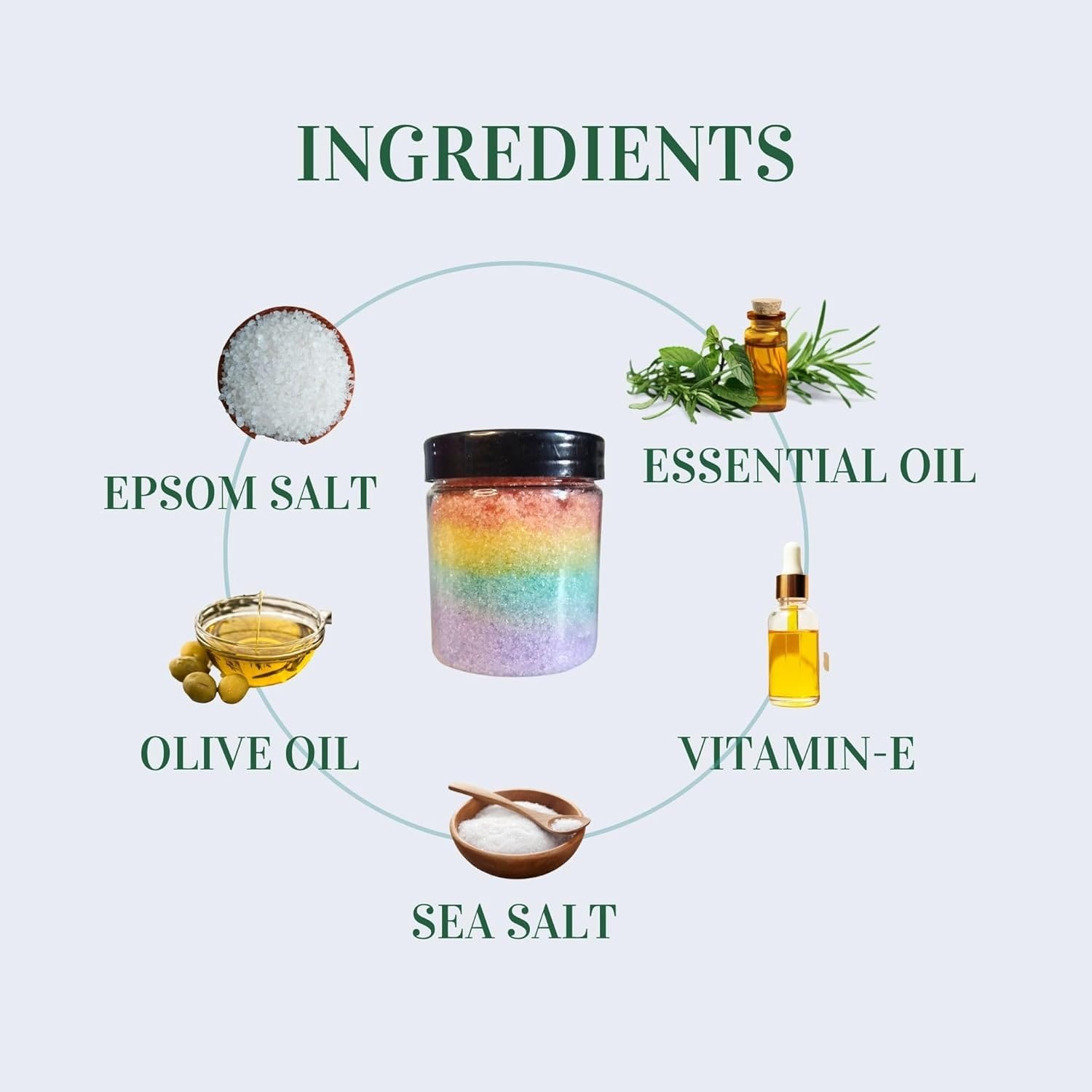 Rainbow Bath Salt helps in muscle pain relief, deeply cleanses the skin, controls acne, and has a soothing aroma.