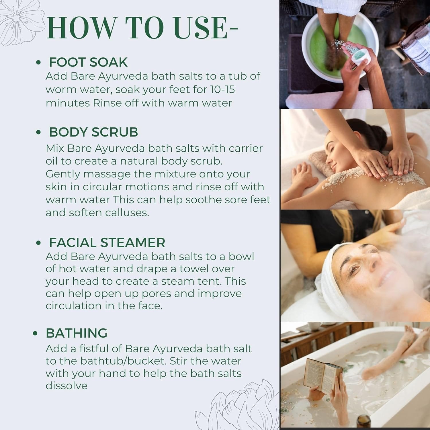 USAGE: Add 2-3 spoonfuls of Bare Ayurveda Rainbow Bath salt in warm water. Circulate the water well. Soak your body or feet in warm water.